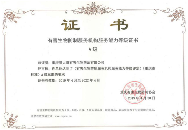 1.品牌優(yōu)勢:貓大哥是重慶*知名、*具專業(yè)水準和*早獲得重慶政府A級認證有害生物防治公司引領(lǐng)者之一。是《中國有害生物防制協(xié)會》、《重慶有害生物防制協(xié)會》的會員單位和常務(wù)理事單位,并連續(xù)獲得《有害生物防制服務(wù)機構(gòu)A級資質(zhì)證書》、《除四害專業(yè)服務(wù)機構(gòu)技術(shù)質(zhì)量認定證》。