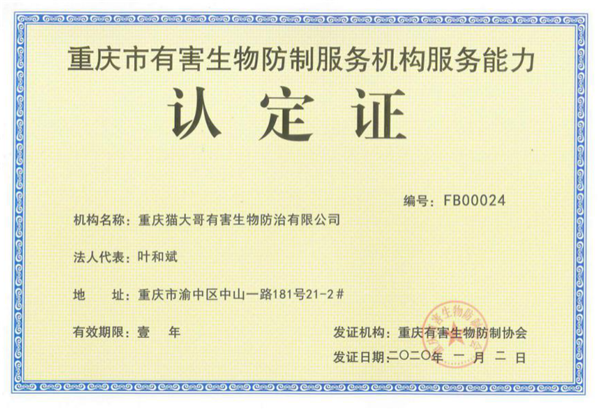 1.品牌優(yōu)勢:貓大哥是重慶*知名、*具專業(yè)水準和*早獲得重慶政府A級認證有害生物防治公司引領(lǐng)者之一。是《中國有害生物防制協(xié)會》、《重慶有害生物防制協(xié)會》的會員單位和常務(wù)理事單位,并連續(xù)獲得《有害生物防制服務(wù)機構(gòu)A級資質(zhì)證書》、《除四害專業(yè)服務(wù)機構(gòu)技術(shù)質(zhì)量認定證》。
