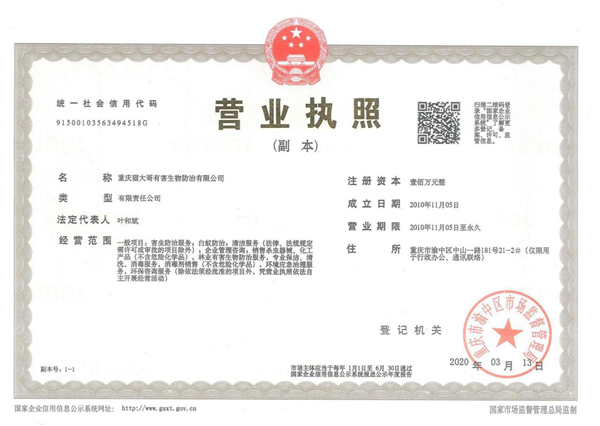 重慶貓大哥有害生物防治有限公司創(chuàng)立于2006年,公司屬“A”級資質(zhì)公司,位于重慶渝中區(qū)觀音巖抗建堂大廈21-2,是重慶有害生物防治領(lǐng)域先行者之一,是經(jīng)工商,稅務(wù),質(zhì)檢,衛(wèi)健委等審批的合法企業(yè);并榮獲多屆專業(yè)委員會評選的優(yōu)秀企業(yè),是集生產(chǎn)、經(jīng)營滅鼠、殺蟲、消毒藥械及提供:除甲醛、滅白蟻、鼠、蟑、蚊、蠅、蟻、蚤、虱、螨、蜱等有害生物防治、林業(yè)有害生物防治、消毒服務(wù)、環(huán)境應(yīng)急治理服務(wù)、環(huán)境咨詢服務(wù)為一體的專業(yè)技術(shù)團隊。